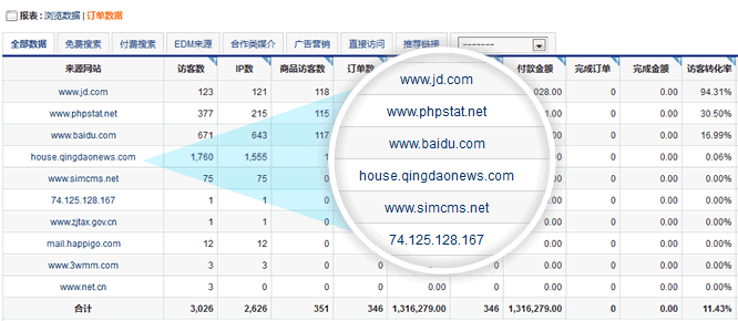 来源网站效果数据,了解每个外部网站带来的访客,订单,付款订单以及完成订单的转化情况