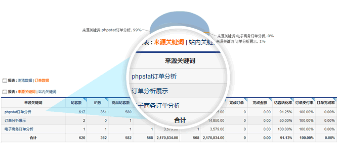 搜索关键词效果数据,了解每个外部搜索关键词带来的访客,订单,付款订单以及完成订单的转化情况